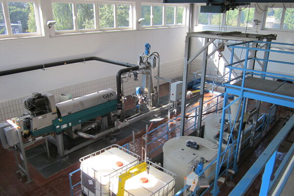 Nach Leistungsfahrten von vier Herstellern und nachfolgender Auswertung der Versuchsergebnisse wurde die Auswahl für eine Hochleistungszentrifuge mit einem Durchsatz von 25 Kubikmetern pro Stunde getroffen. Die technische Ausrüstung umfasste außerdem die Neuausrüstung des Zentrifugenbeschickungspumpwerkes als regelbare Exzenterschneckenpumpe und der Aufbereitungsanlage polymerer Flockungshilfsmittel.