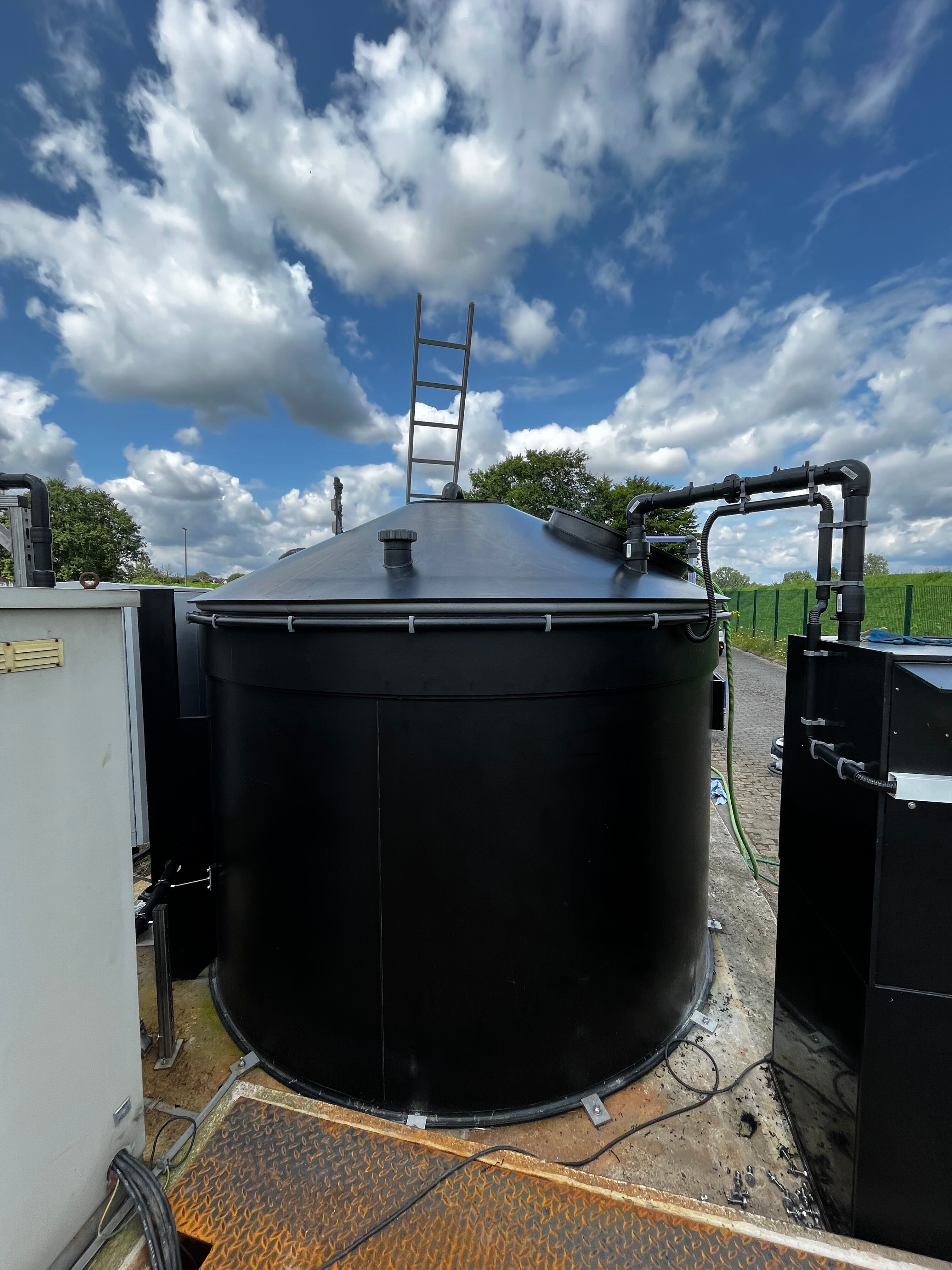 Den neuen Fällmittelbehälter mit 10 Kubikmetern Volumen haben wir als Behälter-in-Behälter-System aus Polyethylen (PE-HD) ausgeführt. Durch die Wahl eines Flachbodenbehälters ist ein Erreichen sämtlicher Aggregate auf dem Behälterdach mit einer kleinen, mobilen Treppenanlage möglich. So konnte auf eine festmontierte Aufstiegskonstruktion mit Gitterrostpodest auf dem Behälterdach verzichtet werden. Der äußere Behälter ist mit einem Leckage-Überwachungssystem ausgerüstet und dient als Auffangwanne gemäß WHG-Vorgaben.