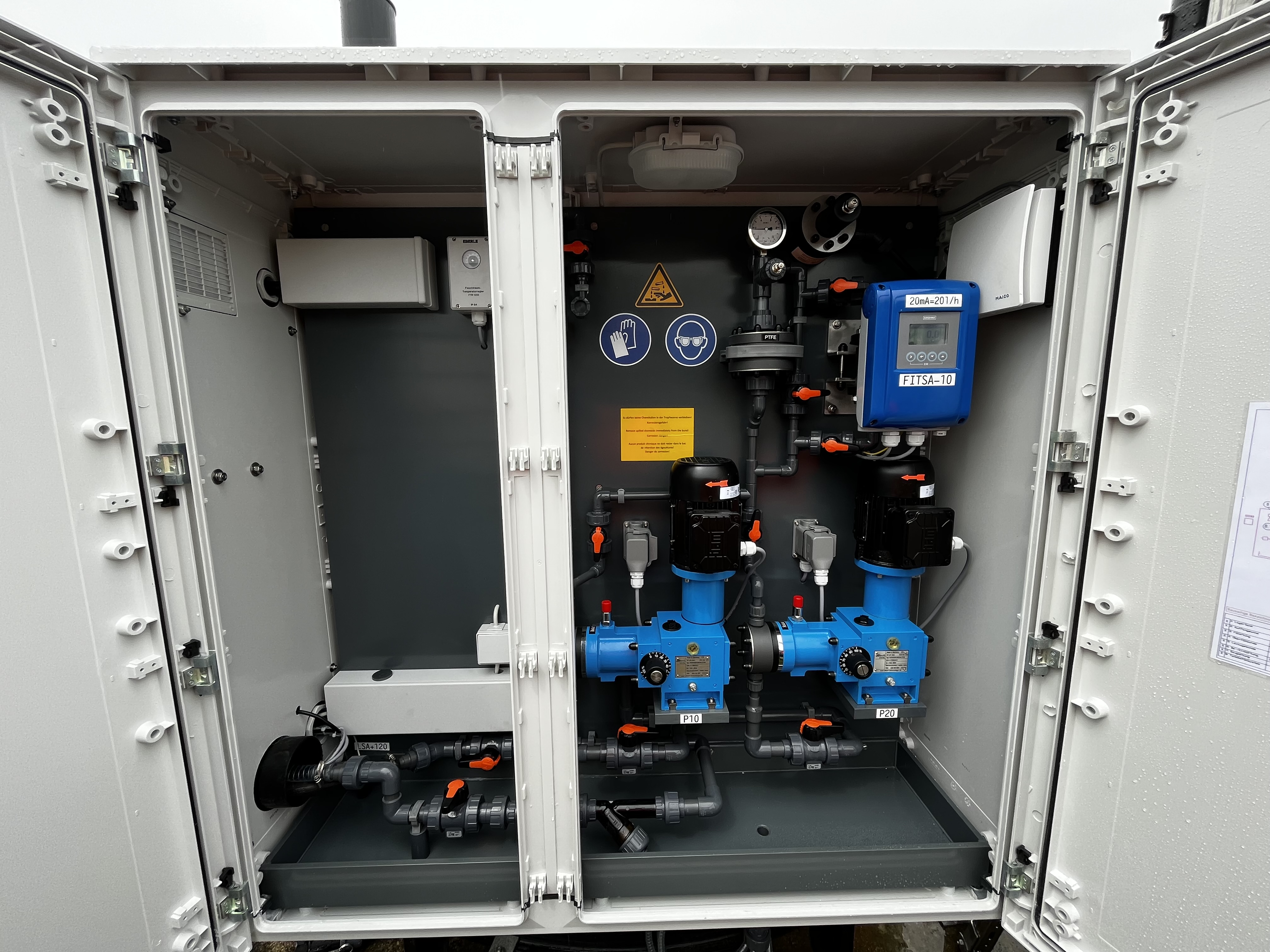 Die Dosierstation besteht aus zwei Kolben-Membran-Dosierpumpen und einer magnetisch induktiven Durchflussmessung. Im Zuge der Montagearbeiten wurde die alte Dosierleitung demontiert. Von der neuen Fällmitteldosierstation gelangt das Fällmittel über eine ca. 2,5 Meter hohe Schlauchbrücke zum Belebungsbecken und verläuft dann entlang der Bauwerksinnenwand etwa 50 Meter bis zur eigentlichen Dosierstelle.