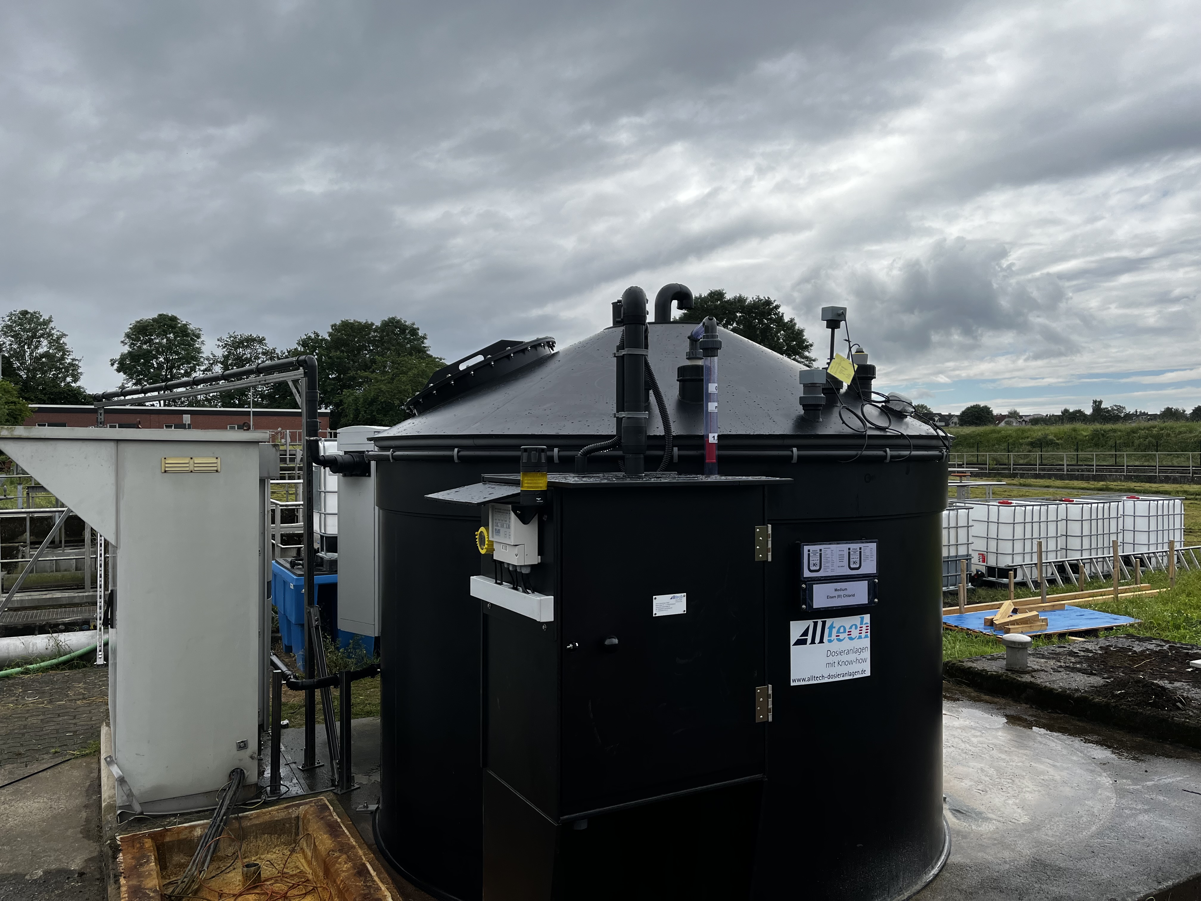 Die Fällmitteldosierstation auf der Kläranlage Hersel dient der Simultanfällung zur Phosphorelimination. Sie bestand aus einem 20 Kubikmeter großen Fällmittelbehälter sowie bis zu zwei IBC Container für ein alternatives Fällmittel. Der Fällmittelbehälter mit einem Befüllstutzen sowie der Steuer- und Dosierschrank hatten mittlerweile ihren Lebenszyklus erreicht und sollten durch ein neues System mit kleinerem Behälter ersetzt werden.